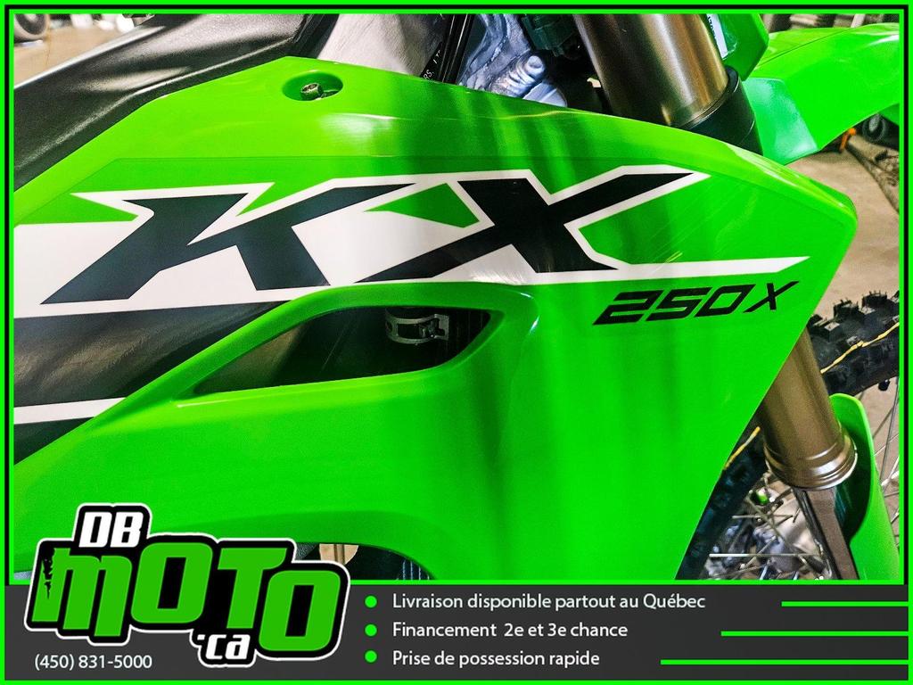 2025 KAWASAKI KX250X<br><br>Financement facile et rapide disponible<br><br>- NOUVEAU système d'échappement pour une puissance accrue et une meilleure centralisation des masses<br>- Angle d'admission révisé et réglages de l'injection de carburant optimisés pour le tout-terrain<br>- Forme de piston révisée<br>- NOUVEL équilibreur primaire de vilebrequin à un arbre<br>- Embrayage hydraulique à disque conique et ressort<br>- Fourche SHOWA ø49 mm à ressort hélicoïdal et monoamortisseur avec réglages révisés<br>- NOUVELLES poignées ODI Lock-On<br>- NOUVELLE carrosserie et nouveaux carénages pour une meilleure interface avec le pilote<br>- NOUVELLE forme de boîte à air avec panneau latéral à dégagement rapide<br>- Borne de raccordement 12 V pour les accessoires du marché secondaire<br><br>Nous reprenons tous vos échanges : côte à côte, vtt, moto, motocross, motomarine, auto, voiture, camion et de tous les marques : bombardier, polaris, cf moto, arctic cat, brp, honda, yamaha, suzuki et plus !<br><br>Vous pouvez retrouver ce véhicule au 2069 route 125 à ste-julienne<br><br>Faites votre demande en ligne en quelques minutes !<br><br>Jusqu'à la 3e chance au crédit. Nous avons des spécialistes en rétablissement de crédit.<br><br>https://www.dbmoto.ca/fr/financement/<br><br>Ou faites votre demande de crédit par téléphone au 450-831-5000 poste 104<br><br>Voyez notre inventaire complète sur notre site web : www.dbmoto.ca<br><br>WE SPEAK ENGLISH TOO !
