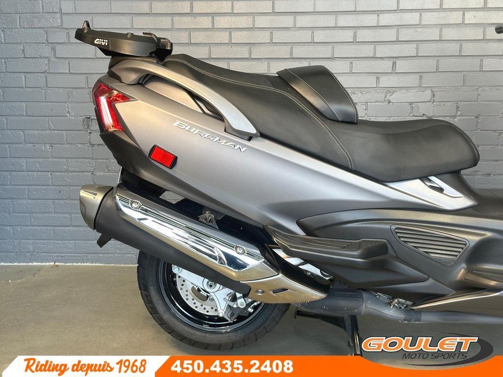 MAXI SCOOTER BURGMAN AN650 EXECUTIVE 2018 \*\*\* Super propre, modèle Executive mieux équipé, rack Givi arrière \*\*\* La Suzuki Burgman AN650 Executive 2018 est un maxi-scooter haut de gamme, offrant confort et performance avec son moteur bicylindre de 638 cm³. La version Executive du scooter Burgman 650 vient avec des équipements de luxe supplémentaires. Moteur : Bicylindre en ligne de 638 cm³ refroidi par liquide de 54,7ch Transmission : Automatique à variation continue (CVT) Sièges chauffants : Siège conducteur et passager chauffant (version Executive) Rétroviseurs électriques : Réglage électronique des rétroviseurs (version Executive) Espace de rangement : Coffre sous la selle pouvant accueillir un casque intégral et un grand espace Pare-brise ajustable : Pare-brise réglable électriquement (version Executive) Mode de conduite sélectionnable : Trois modes de conduite (Drive, Power et Manual), Système de contrôle de traction (TCS) et freins ABS Cette unité est chez Goulet Moto Sports de Ste-Thérèse. Téléphonez au 450.435.2408 Possibilité de financement avec plusieurs institutions financières. 2ième chance au crédit disponible. Goulet Moto Sports est votre concessionnaire moto depuis 1968. Fier représentant officiel des marques HONDA, APRILIA, MOTO GUZZI, VESPA, PIAGGIO, KTM, NIU, SURRON et URAL pour le grand Montréal. Nous avons un énorme choix de moto usagés inspectées par nos professionnels. 2 adresses pour vous servir, soit à Sainte-Thérèse (450.435.2408) et Saint-Jérôme (450.431.6622). Goulet Moto Sports ne peut être tenu responsable d'une omission, d'un délai ou d'une erreur de transcription de l'information. Le prix affiché reflète la condition de l'unité. Pour différentes raisons les prix peuvent différer de ceux indiqués en ligne. Les données sont affichées à titre indicatif seulement et ne peuvent être considérées comme une information contractuelle. Nous vous encourageons vivement à nous consulter pour plus de détails avant de vous déplacer. Des frais tels que taxes, immatriculation, administrations ou autres peuvent s'appliquer. se compare a un scooter Honda Silverwing, Yamaha T-Max, Piaggio BV400, Piaggio MP3 Transmission: CVT, Système de refroidissement: Refroidi au liquide, 2 cylindres, 55.0 CV, 638.0 CC, Garantie: 1 mois ---------------------- 2018 BURGMAN AN650 EXECUTIVE MAXI SCOOTER \*\*\* Super clean, better-equipped Executive model, Givi rear rack \*\*\* The 2018 Suzuki Burgman AN650 Executive is a high-end maxi scooter, offering comfort and performance with its 638cc twin-cylinder engine that develops 54.7 hp. It combines a continuously variable automatic transmission (CVT), excellent handling, and luxury features. The Executive version of the Burgman 650 scooter comes with additional luxury features such as adjustable rear suspension, heated driver and passenger seats, power-closing mirrors, and an electric windshield. This unit is available at Goulet Moto Sports in Ste-Thérèse. Call 450.435.2408. Financing available with several financial institutions. Second chance credit available. Goulet Moto Sports has been your motorcycle dealer since 1968. We are a proud official representative of HONDA, APRILIA, MOTO GUZZI, VESPA, PIAGGIO, KTM, NIU, SURRON, and URAL brands in Greater Montreal. We have a huge selection of used motorcycles inspected by our professionals. We have two locations to serve you: Sainte-Thérèse (450.435.2408) and Saint-Jérôme (450.431.6622). Goulet Moto Sports cannot be held responsible for any omission, delay, or transcription error. The price displayed reflects the condition of the unit. For various reasons, prices may differ from those indicated online. The data displayed is for informational purposes only and should not be considered contractual information. We strongly encourage you to contact us for more details before visiting. Fees such as taxes, registration, administration, and other charges may apply. compares to a Honda Silverwing, Yamaha T-Max, Piaggio BV400, Piaggio MP3 scooter Transmission: CVT, Cooling System: Liquid cooling, 2 cylinders, 55.0 HP, 638.0 CC, Warranty: 1 mois