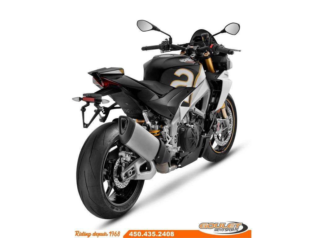 APRILIA TUONO V4 1100 FACTORY - ULTRA GOLD \*\*\* TRANSPORT ET PRÉPARATION INCLUS DANS LE PRIX \*\*\* L'Aprilia Tuono V4 Factory est une véritable machine à performance, avec de nouvelles lignes, un nouvel aérodynamisme avec des ailerons intégrés, un bras oscillant issu du Moto GP, une électronique avancée et 175 puissants chevaux. La version Factory possède une position de conduite plus sportive, la coque arrière de la RSV4 mais surtout les Suspensions Électronique Active Olhins - Moteur V4 de 1077cc devellopant 175hp et 89 lbs-ft de couple (torque). - Nouveau bras oscillant (swingarm) en aluminium plus léger et doté d'un renfort inférieur comme en MotoGP. - Suspension Électronique Active par Olhins. - 6 modes de conduites, 3 pour la route, 3 pour la piste - Traction Control ajustable en route (8 modes), Wheelie Control (3 modes), Frein Moteur ajustable, ABS ajustable - Quickshift Up&Down - Régulateur de vitesse (Cruise Control) - Écran couleur TFT, Bluetooth ready. - Groupe lumière avant au LED. Cette unité est chez Goulet Moto Sports de Ste-Thérèse. Téléphonez au 450.435.2408 Possibilité de financement avec plusieurs institutions financières. 2ième chance au crédit disponible. Le financement special Aprilia est disponible uniquement sur prix PDSF (voir condition sur site Aprilia Canada) Goulet Moto Sports est votre concessionnaire moto depuis 1968. Fier représentant officiel des marques HONDA, APRILIA, MOTO GUZZI, VESPA, PIAGGIO, KTM, NIU, SURRON et URAL pour le grand Montréal. Nous avons un énorme choix de moto usagés inspectées par nos professionnels. 2 adresses pour vous servir, soit à Sainte-Thérèse (450.435.2408) et Saint-Jérôme (450.431.6622). Essence, Transmission: Manuelle, 6 vitesses, Système de refroidissement: Refroidi au liquide, 4 cylindres, 175.0 CV, 1077.0 CC, Poids: 407.00 lbs, Garantie: 2 ANS ---------------------- APRILIA TUONO V4 1100 FACTORY - ULTRA GOLD \*\*\* TRANSPORT AND PREPARATION INCLUDED IN THE PRICE \*\*\* The Aprilia Tuono V4 Factory is a true performance machine, with new lines, new aerodynamics with integrated fins, a Moto GP-derived swingarm, advanced electronics and 175 powerful horsepower. The Factory version has a sportier driving position, the rear hull of the RSV4 but above all the Olhins Active Electronic Suspensions - 1077cc V4 engine developing 175hp and 89 lbs-ft of torque (torque). - New swingarm in lighter aluminum and equipped with a lower reinforcement like in MotoGP. - Active Electronic Suspension by Olhins. - 6 driving modes, 3 for the road, 3 for the track - Traction Control adjustable on the road (8 modes), Wheelie Control (3 modes), Adjustable Engine Brake, Adjustable ABS - Quickshift Up&Down - Cruise control (Cruise Control) - TFT color display, Bluetooth ready. - LED front light group. This unit is at Goulet Moto Sports in Ste-Thérèse. Call 450.435.2408 Possibility of financing with several financial institutions. 2nd chance credit available. Le financement special Aprilia est disponible uniquement sur prix PDSF (voir condition sur site Aprilia Canada) Goulet Moto Sports has been your motorcycle dealer since 1968. Proud official representative of the HONDA, APRILIA, MOTO GUZZI, VESPA, PIAGGIO, KTM, NIU, SURRON and URAL brands for greater Montreal. We have a huge selection of used motorcycles inspected by our professionals. 2 addresses to serve you, in Sainte-Thérèse (450.435.2408) and Saint-Jérôme (450.431.6622). Gasoline, Transmission: Manual, 6 speeds, Cooling System: Liquid cooling, 4 cylinders, 175.0 HP, 1077.0 CC, Weight: 407.00 lbs, Warranty: 2 ANS